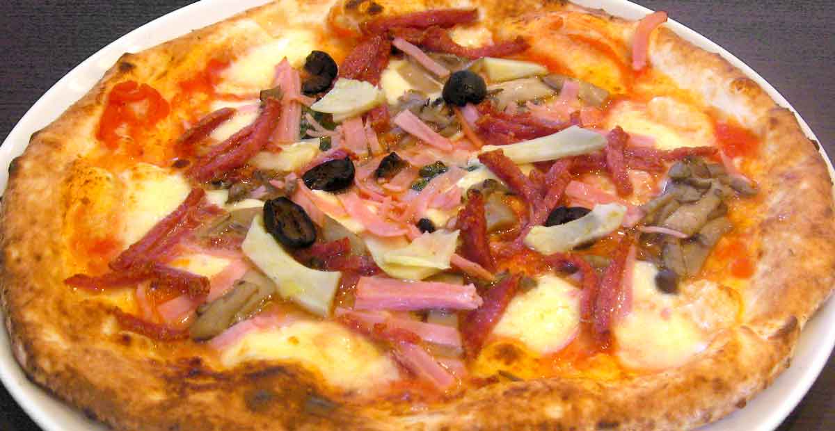 キノコ・ハム・サラミ・オリーブ・アーティチョーク・モッツァレラのトマトソースピッツァ